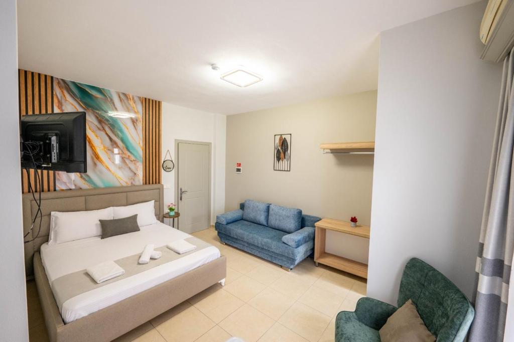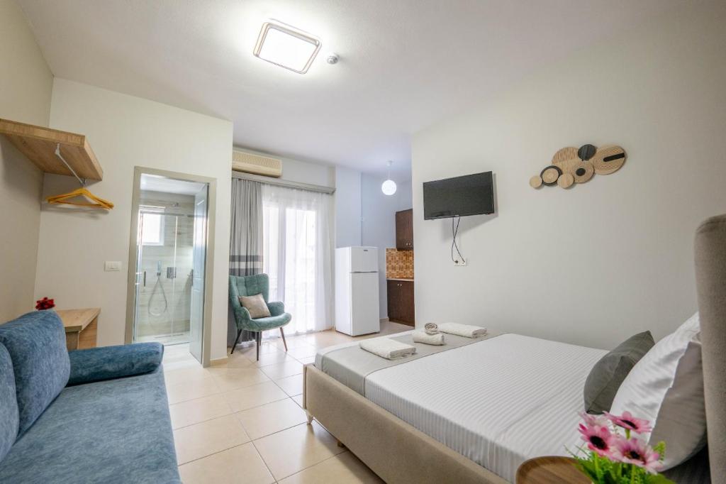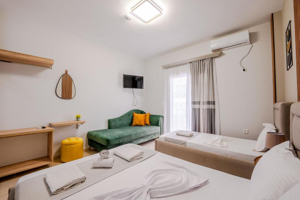 Vila del Mar in Ksamil offers direct beachfront access and a lush garden. Guests enjoy sea views and a tranquil setting. Each aparthotel unit features air-conditioning, a balcony, and a fully equipped kitchen. Additional amenities include a private bathroom, TV, and free WiFi.